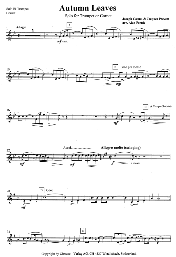 Autumn Leaves - hier klicken Autumn Leaves (Blasorchester; Trompete in Bb), Partitur und Stimmen 128,59