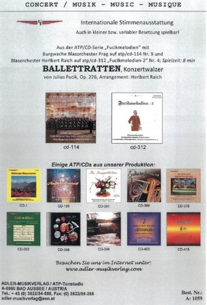 Zusatzinfo/Inhalt Der Walzer „Ballettratten“ (Op. 226) des tschechischen Komponisten Julius Fučík (1872–1916) zählt zu den beliebtesten Werken der Blasmusikliteratur. Ursprünglich für Salonorchester komponiert, wurde der Walzer durch seine melodische Zugänglichkeit und klangliche Vielfalt schnell zu einem Standardrepertoire für Blasorchester. Die bekannteste Bearbeitung für Blasorchester stammt von Heribert Raich. Sie bewahrt Fučíks originale Melodieführung und Harmonik, passt jedoch die Orchestrierung an die Klangmöglichkeiten eines Blasorchesters an.